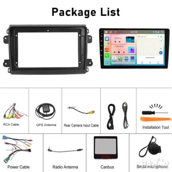 Пълен комплект с цялата рамка, преходни кабели и букси, декодери, предназначени и съвместими за монтиране на конкретния модел автомобил.