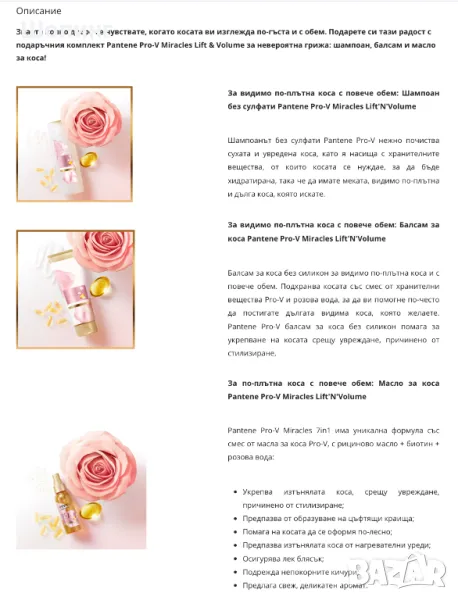 - Комплектът включва: Шампоан за коса Pro-V Miracles, 250 ml + Балсам за коса Pro-V Miracles, 150 ml + Масло за коса 7 в 1 Pro-V Miracles, 145 ml