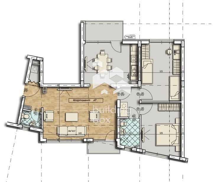 Жилището е с обща площ от 122.98 кв.м. състоящ се от: Дневна, кухненски бокс с трапезария, две спални, баня с тоалетна и тоалетна, склад и 2 тераси..