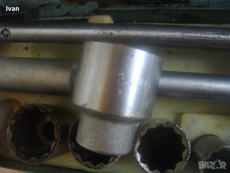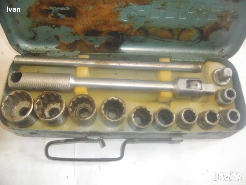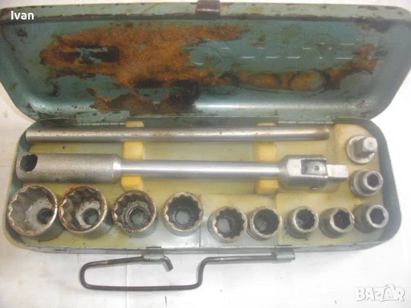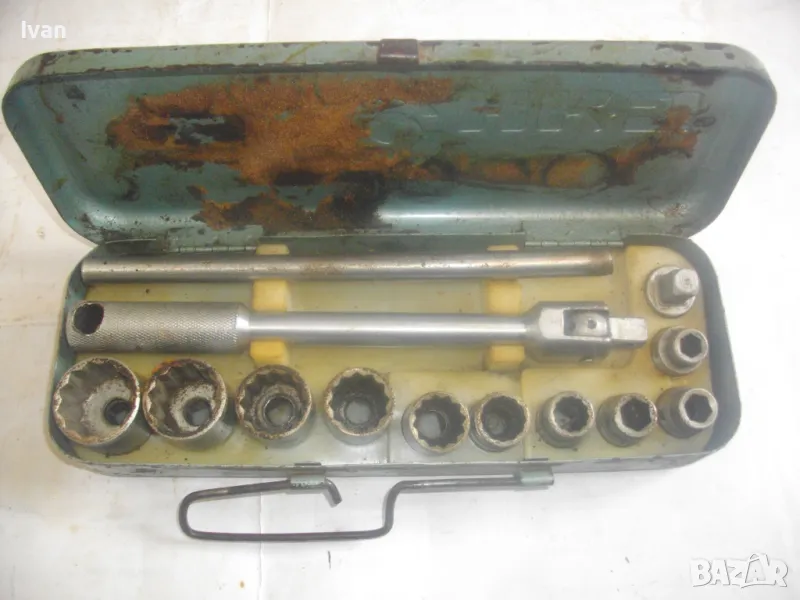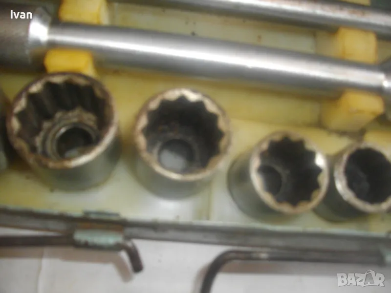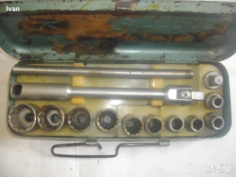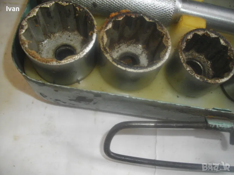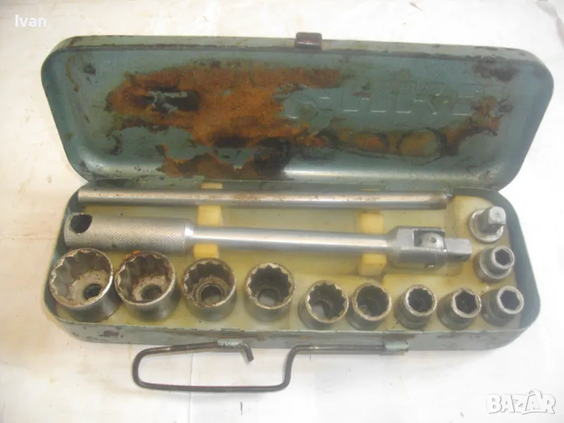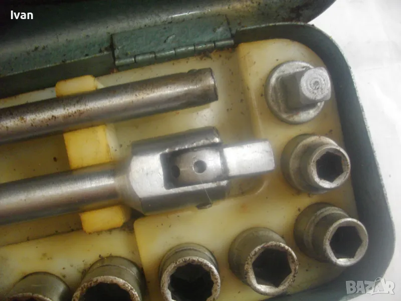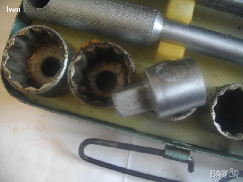 соц производство, което се отличава с висока ефективност и здравина, липсваща в съвремието. Ползван пълен комплект оот 15 части, без липси, със запазен външен вид и оригиналнаата си метална кутия с метална плъзгаща се копчалка. Размери на кутията - 320 х 120 х 60 мм. Марка на гедорията инструменталиум НК.З. Включва адаптер каре за камъни 1 бр., 10 бр. различни вложки торсове оригиинални от 10 мм до 30 мм, силов върток на 2 части ,твърда пластмасова трудночупливаа вложка и металната кутия. Главата квадрат на силови върток е тип чупеща - върти се на 360 градуса. Тегло на гедорията с кутията - 3,5 кг.