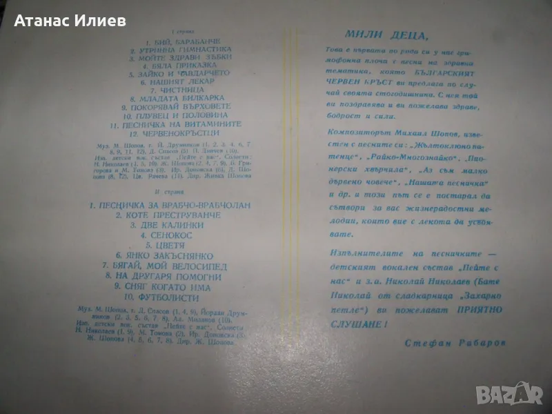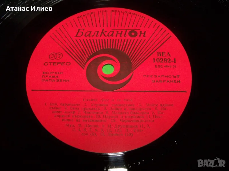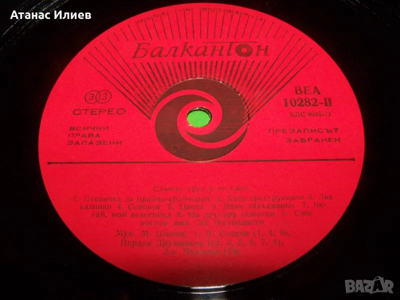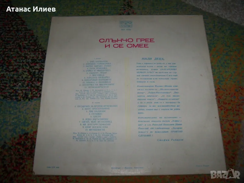 Детски песнички на здравна тематика. Слънчо грее и се смее! Изпълнява детски вокален състав "Пейте с нас" с диригент Ж. Шопова. Плочата е прослушана и е в отлично състояние.