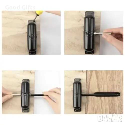 МОНТИРАН Нашият автомат за затваряне пасва както на десни, така и на леви врати, регулирането позволява монтаж дори на тежки врати.