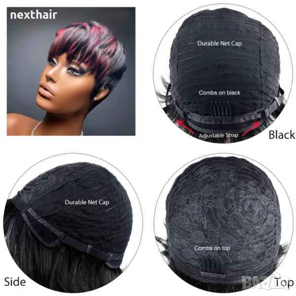 Черна къса пикси синтетична перука с червени кичури → Обява 50207239