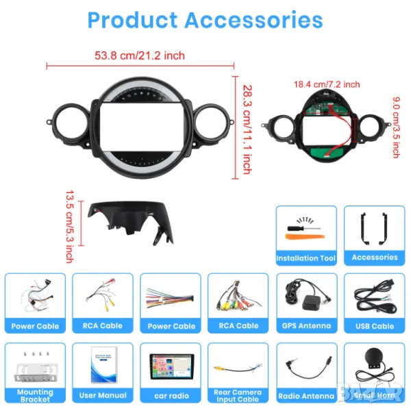 1 x Android мултимедия в рамка за модела на автомобила 1 x Камера за задно виждане с 6-метров кабел