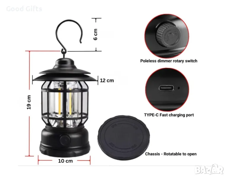 Лампа за къмпинг на батерии с USB зареждане