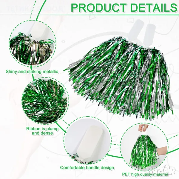 Комплект 6 броя помпони, цвят - зелено и сребристо в комбинация като на снимките. За танци, игри и други забавления. Налични няколко комплекта.