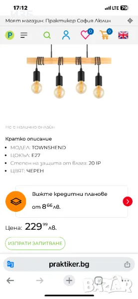 Тип фасонка: E27. Висящата лампа TOWNSHEND се състои от дървена греда с четири окачени черни фасунги за лампи. Фасунгите могат да се окачват на различна височина благодарение на лесното навиване. Висящата лампа е изработена от хармонична комбинация от материали, изработени от борова дървесина с качество FSC и стомана, което се вписва безпроблемно в тенденции като винтидж и индустриален стил. Тя осигурява модерно осветление за всяка стая, независимо дали е в хола или над маса за хранене. Висящата лампа изисква 4 крушки E27, които не са включени.За Пловдив и София може лично предаване