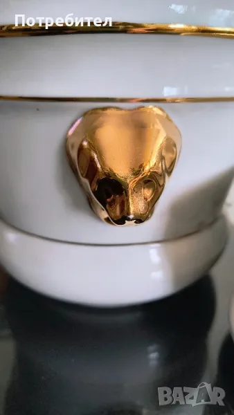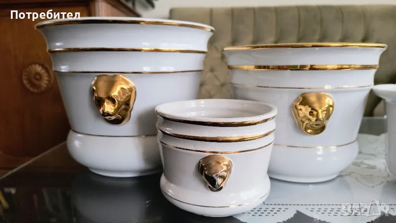 Комплект от три бели порцеланови кашпи с позлатени лъвски глави и четвърта , порцеланова извън комлекта. Размери - 1-ва диаметър 21см., височина- 17 см, 2-ра 18/ 14 см., 3-та- 11/ 9 см.,