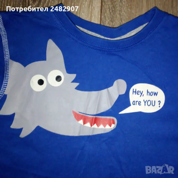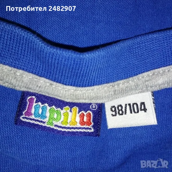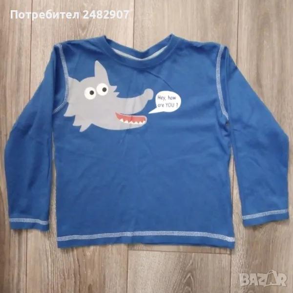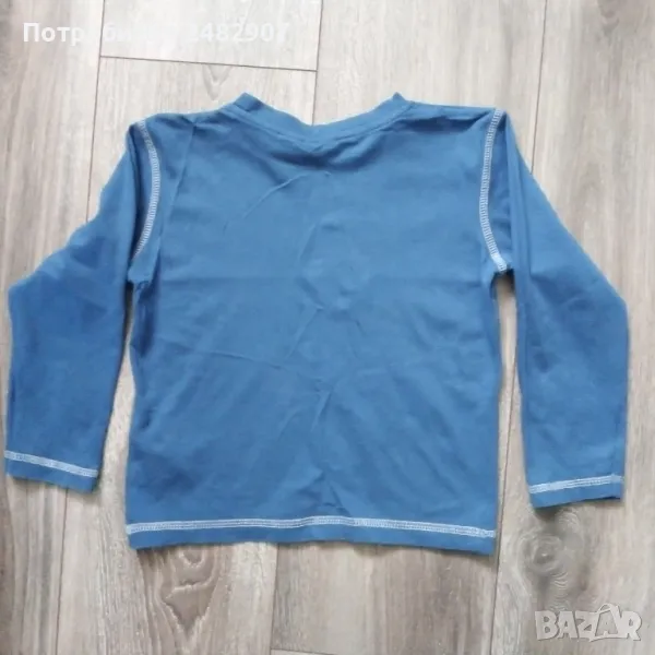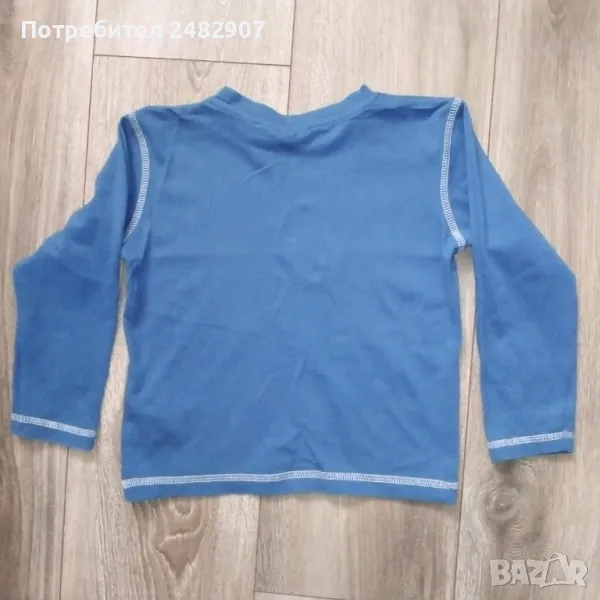 Синя детска блуза с щампа за ръст 98-104 см. Съдържа 100 % памук. Ширина в раменете - 31 см, ширина под мишниците - 36 см, ширина в долната част - 34 см, дължина от рамото до долу - 39,5 см, дължина на ръкава от рамото - 35 см, ширина на ръкава в долната част - 9 см. Много запазена, почти не е използвана.