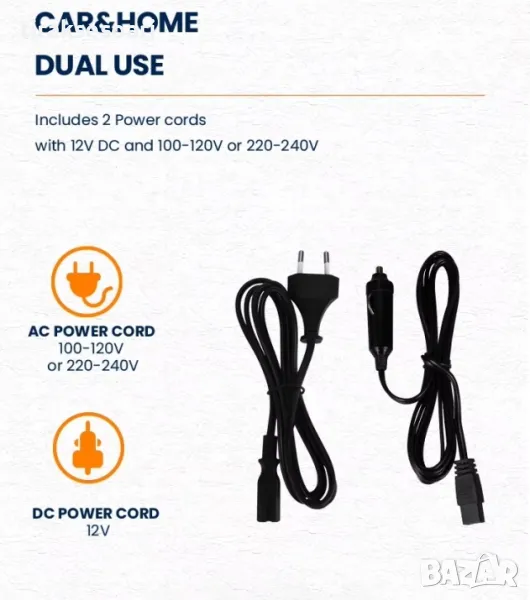 Двойно захранване: 12V (автомобилен контакт) и 220–240V (стенен контакт)