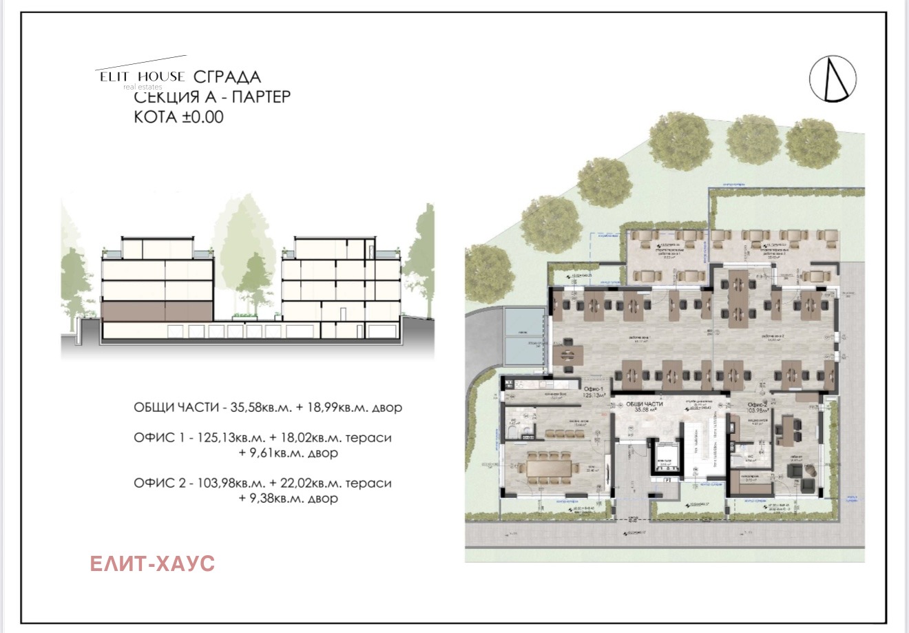 ЕЛИТ ХАУС, представя модерно и просторно помещение подходящо за Клиника, Лаборатория, представителство, Шоурум, с височина на помещенията 3.20м., излаз на красив озеленен собствен двор 60кв.м., две покрити тераси, площта на помещението е 230кв.м., и в момента е оставено напълно отворено OPEN SPACE, красиви френски витрини, Алуминиева дограма, Газ, възможност за подово отопление, към него се продават и три подземни самостоятелни гаража за обща продажна цена 90 000 евро!