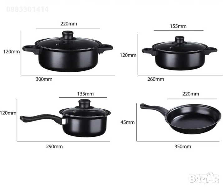 Комплектът е изработен от висококачествена желязна сплав, с незалепващо покритие отвътре, капак от закалено стъкло и топлоизолирани дръжки отвън, черен външен вид, класически и лесен за използване.