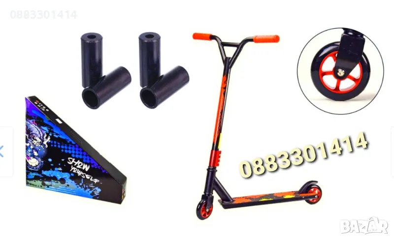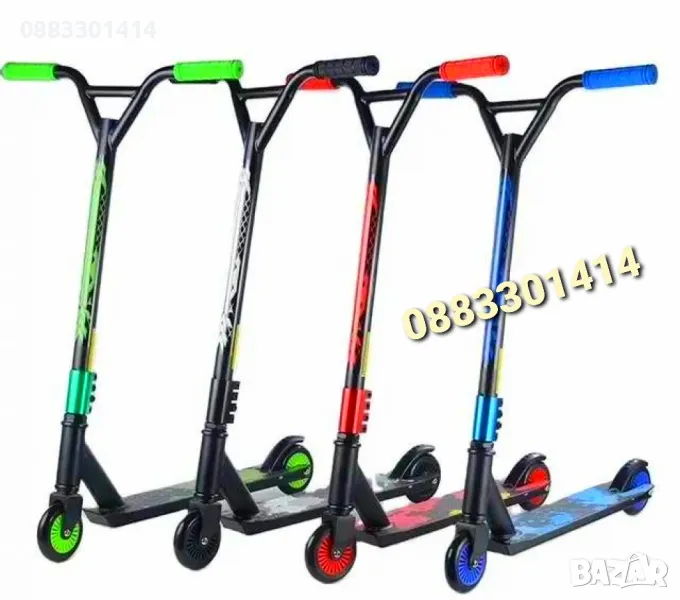 Тротинетка за трикове с метална спирачка и гумени ръкохватки.