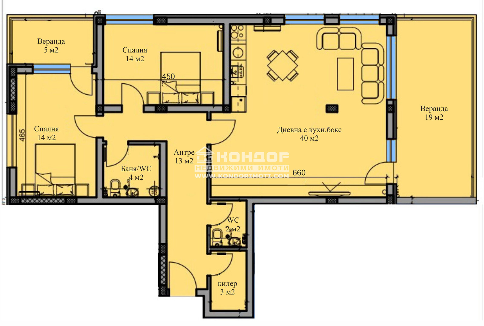 Апартаментът, който Ви предлагаме се състои от просторна ъглова, югоизточна дневна 40кв.м., оформена на кътове с излаз на веранда 19кв.м., две големи самостоятелни спални по 14кв.м., баня с тоалетна, втора тоалетна, килер подходящ за перално помещение, антре и още една веранда.