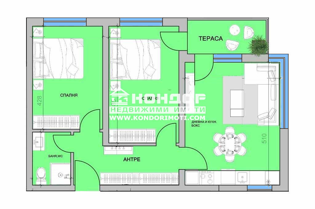 Оферта 60790: Предлагаме ви жилище в модерна жилищна сграда с Акт 16, която подсигурява на своите обитатели комфортна среда на живот чрез просторни семейни жилища с интелигентно проектирани вътрешни пространства, предлагащи изключителни удобства, ниски разходи за енергия и поддръжка, както и малък процент общи части. Имота който ви предлагаме се състои от добре осветена дневна с кухненски бокс, две спални, баня с тоалетна, входно антре, тераса. Съвременно строителство - фасада с 10 см. топлоизолация и силикатна мазилка с висока устойчивост на цвета, тераси с метални парапети от ковано желязо, поцинковани, 5 камерна РVС дограма с двоен стъклопакет, под с топло изолация и циментова замазка, стени и тавани - гипсова мазилка с машинно полагане, под на тераси хидроизолация + гранитогрес, входна врата - луксозна метална, блиндирана, хидравличен асансьор. Сградата е разположена в близост до няколко модерни спортни комплекса с тенис, футболни игрища и други спортни площадки. На броени минути с автомобил се намира центъра на града, МОЛ-Пловдив, Гребна база, големите супермаркети - Лидъл, Кауфланд, Лекси, Триумф, болници - УМБАЛ Св.Георги и УМБАЛ Пълмед, както и училища и детски градини. За удобството на живущите има осигурени подземни Гаражи.