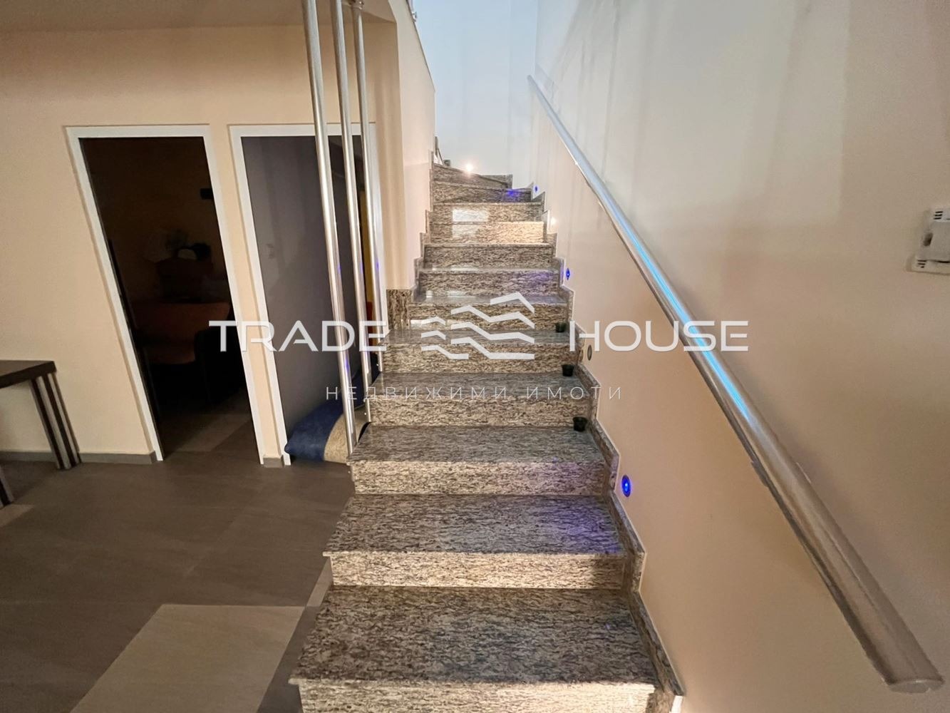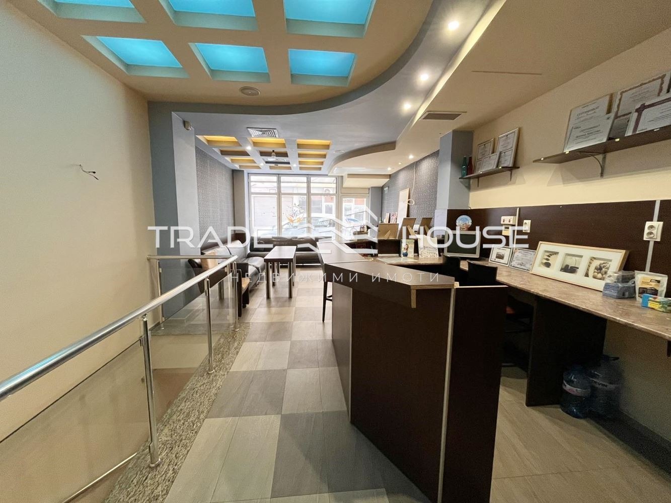 Разпределение: зала с тоалетна и предверие (партер), основно помещение, кабинет и склад с естествена светлина (сутерен). Свързани с вътрешно стълбище с гранит и LED осветление.