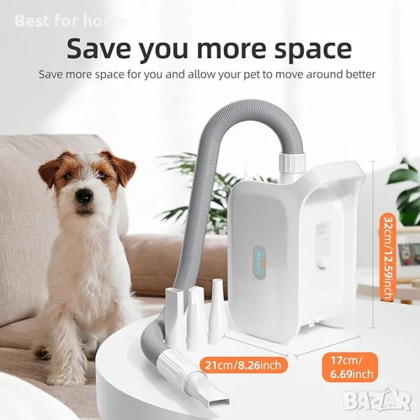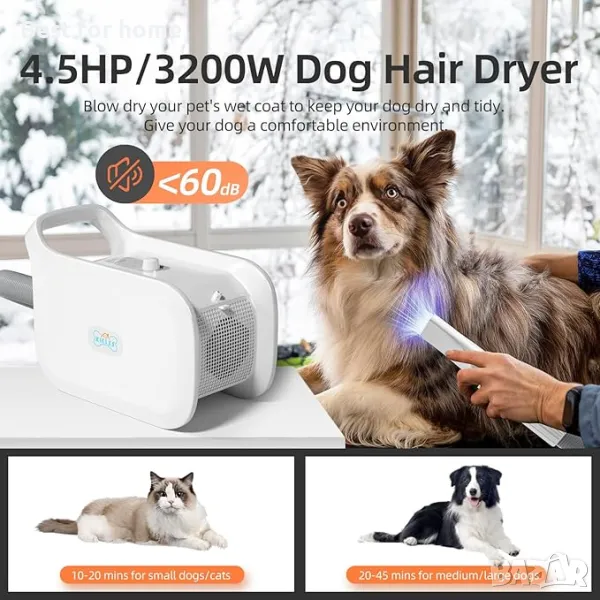 Професионален високоскоростен сешоар за домашни любимци: Професионалният високоскоростен сешоар за домашни любимци XKISS има мощен и стабилен мотор с изходна мощност 3200 W/60 HZ, напрежение AC 220-240 V, скоростта на вятъра може да се регулира свободно до 75 m/s чрез въртящото се копче. Сушилните за кучета могат да изсушат козината на вашия домашен любимец бързо и да ви спестят много време.