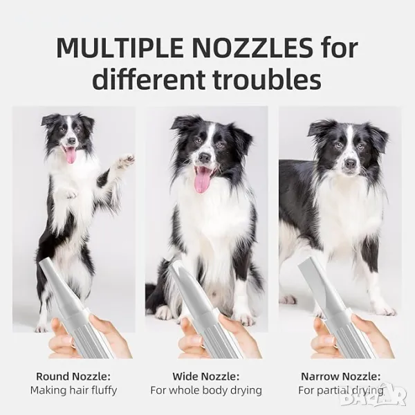 3 различни дюзи: сушилнята за кучета се предлага с въздушен филтър и три различни дюзи - кръгла дюза, широка дюза, тясна дюза, за да отговори на всички изисквания за сушене и е подходяща за различни видове кучета. Сушенето за кучета е по-нежно и бързо.