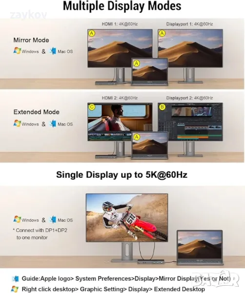 UHD мултимедиен дисплей: Двоен 4K @60Hz (4096x2160) и 5K при 60Hz; Двоен/троен дисплей (включително дисплей за лаптоп) по ваш избор, USB 3.0 докинг станцията лесно разширява или отразява изображението от лаптопа към монитор/проектор/HDTV чрез DisplayPort и HDMI порт. С UHD резолюция, която осигурява повече пиксели за по-рязко и красиво качество на картината и без забавяне (Забележка: Когато свържете 2-та Displayport порта на USB докинг станцията към монитор, може да се постигне резолюция 5k@60Hz).