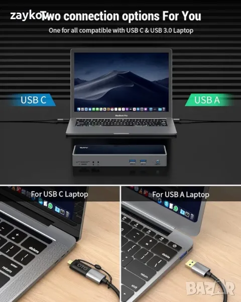 Универсална докинг станция: USB докинг станцията поддържа три дисплея както за MacOS, така и за Windows системи. Вашият първи избор за работа от дома или офиса, тази докинг станция е добре съвместима с лаптопи с USB A или USB C; Всичко в едно решение за два вида нужди от лаптопи, което ви осигурява мощни и гъвкави възможности за разширение, спестявайки ценно пространство на работния плот и подобрявайки ефективността на работата.