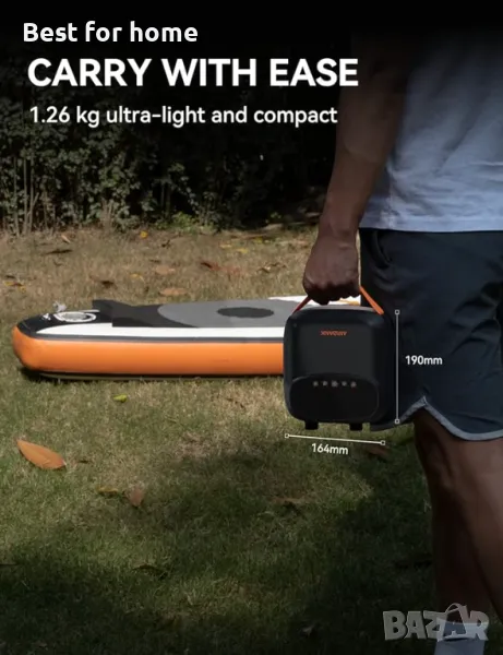 【УЛТРАЛЕК И ПРАКТИЧЕН】SUP помпата PUFFER Pro тежи само 1,25 кг и е с размери 164 x 86 x 190 мм, което я прави изключително преносима и лесна за носене. Тази компактна SUP помпа се предлага с вградена найлонова дръжка и чанта за носене за ваше удобство, като лесно се побира в раницата ви и оставя повече място за останалата ви екипировка.
