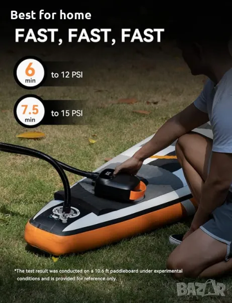 【МНОГОСТРАННА УПОТРЕБА】Със 7 висококачествени дюзи от найлон и фибростъкло, PUFFER Pro може лесно да надуе всички ваши падълбордове (включително вентили C7, D7), крила и кайт, каяци, басейни, плувни пръстени или други надуваеми съоръжения. Просто задайте желаното налягане и оставете помпата да свърши работата, като автоматично ще спре, когато се достигне целевото налягане.