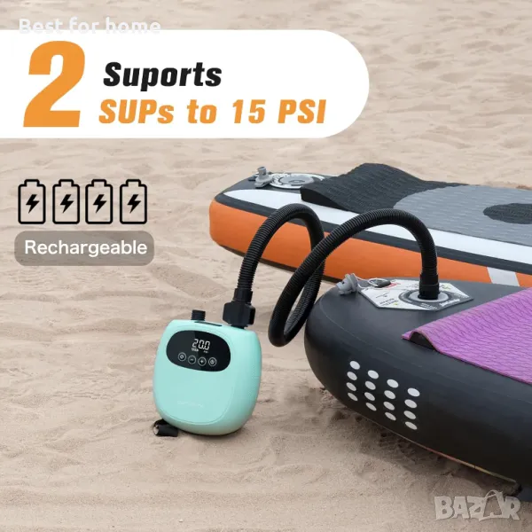 【Акумулаторна интелигентна помпа】С акумулаторни батерии от 2600 mAh можете да надуете вашата SUP дъска навсякъде. Достатъчно е да надуете две 10,5' SUP дъски до 15 PSI. По време на напомпването, интелигентната система за безопасност автоматично ще спре напомпването, когато достигне зададеното целево налягане, за да гарантира безопасността. Не можеше да се похвали, че не е дошъл да го види.