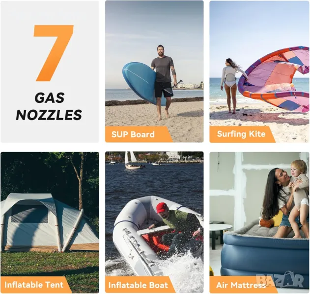 【Преносим и уникален дизайн】Размерът на електрическата SUP помпа е 7,64"*6,89"*3,46", а теглото 2,51 фунта (1,27 кг). С дръжка, преносима за носене. Нашата помпа захранва и вашия телефон, лесна за опаковане в раница и използване навсякъде по всяко време. Нашата въздушна помпа за надуваеми лодки е оборудвана със 7 адаптера за клапани, не само за SUP, но може да се използва и за надуване на каяци, крилца за ветроходни лодки.