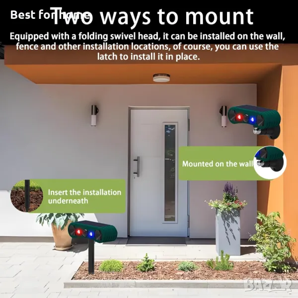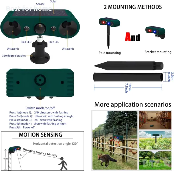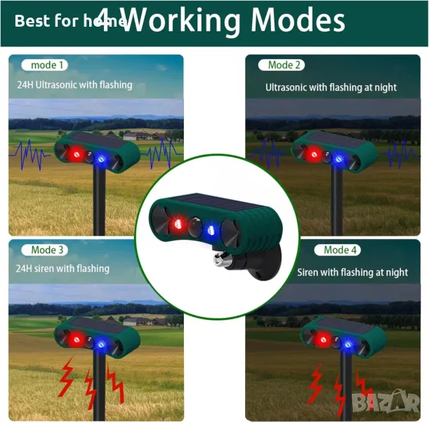 【4 режима】Слънчевият контролер за стробоскопична аларма има 4 режима на работа по избор: Режим 1: 24 часа ултразвуков с мигане; Режим 2: ултразвуков с мигане през нощта; Режим 3: 24 часа сирена с мигане; Режим 4: сирена с мигане през нощта.