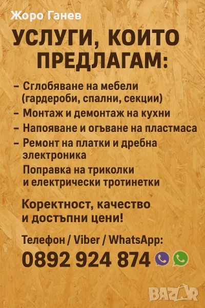 Всички цени са в лева и включват само труд (без транспорт и материали). При нужда от транспорт – по договаряне.