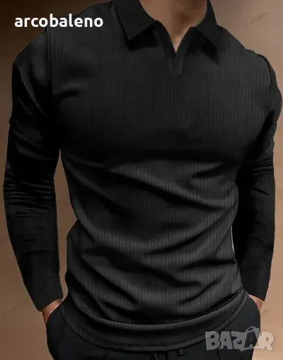 Ежедневна мъжка поло тениска с дълъг ръкав, разтеглива вертикална лента и V-образно деколте