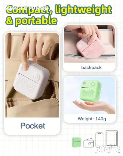 Нашият джобен принтер се отличава с размер на дланта и леко тяло, което ви позволява да поставите в джоба или чантата си и да го носите навсякъде.