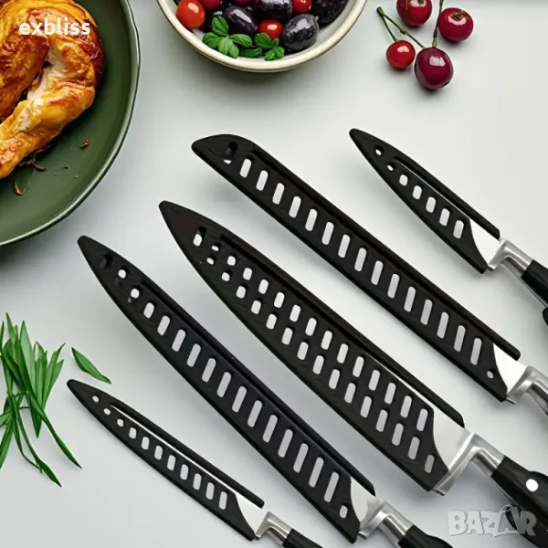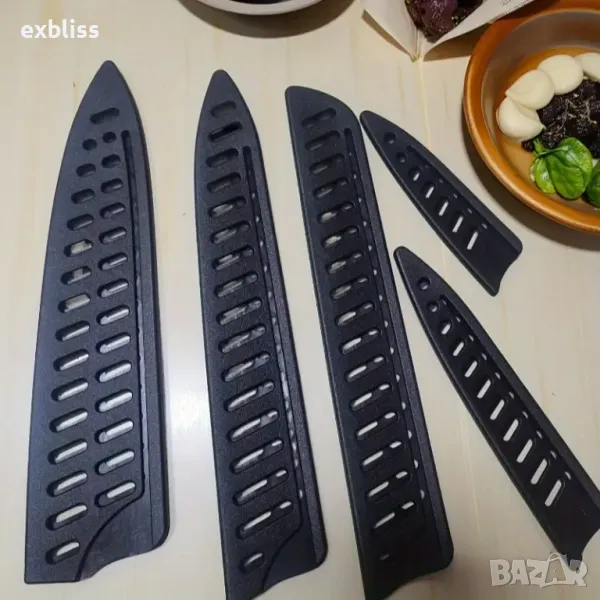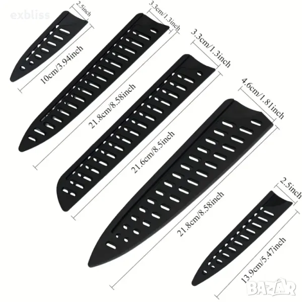 Всеки предпазител в комплекта е универсален, което означава, че е проектиран да пасва на различни видове ножове – от готварски ножове и ножове за хляб до ножове за филетиране и други. Изработени от качествена, издръжлива пластмаса, тези защитни калъфи обхващат плътно острието, предотвратявайки случайно порязване при посягане към чекмеджето или при транспортиране на ножовете.