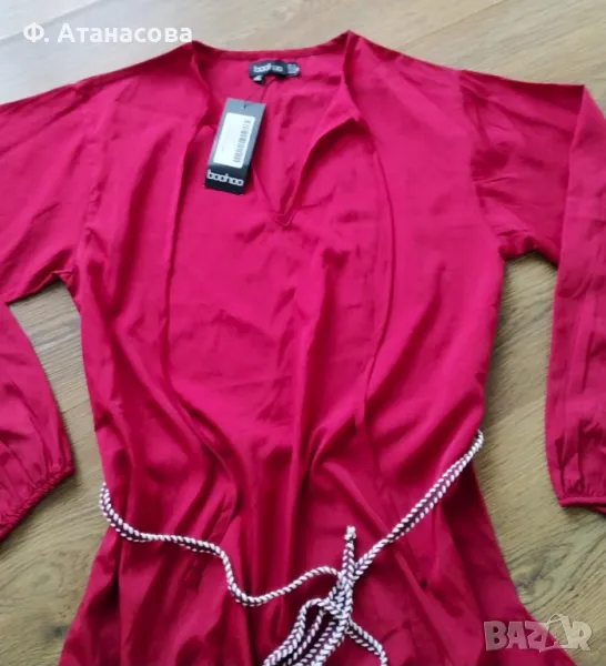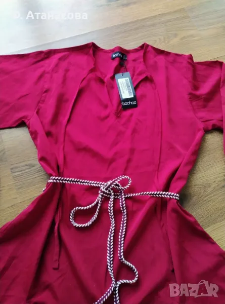 Уникално красива рокля / дълга туника от лека и мека материя на марката Boohoo. Моделът е втален и разкроен от талията, с дълги ръкави. Има коланче. На врата има връзки, които може да се вържат или да се носят отворени.