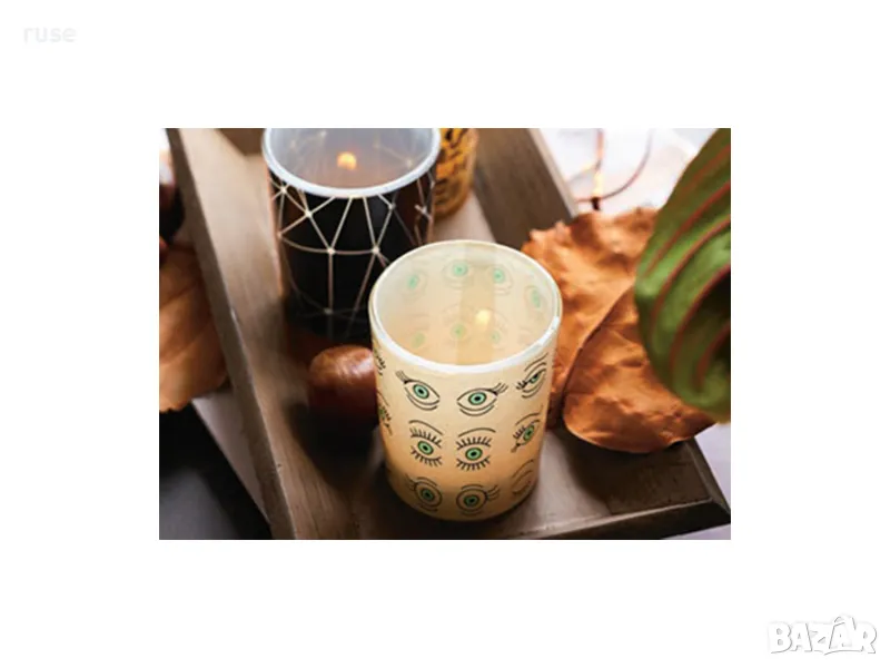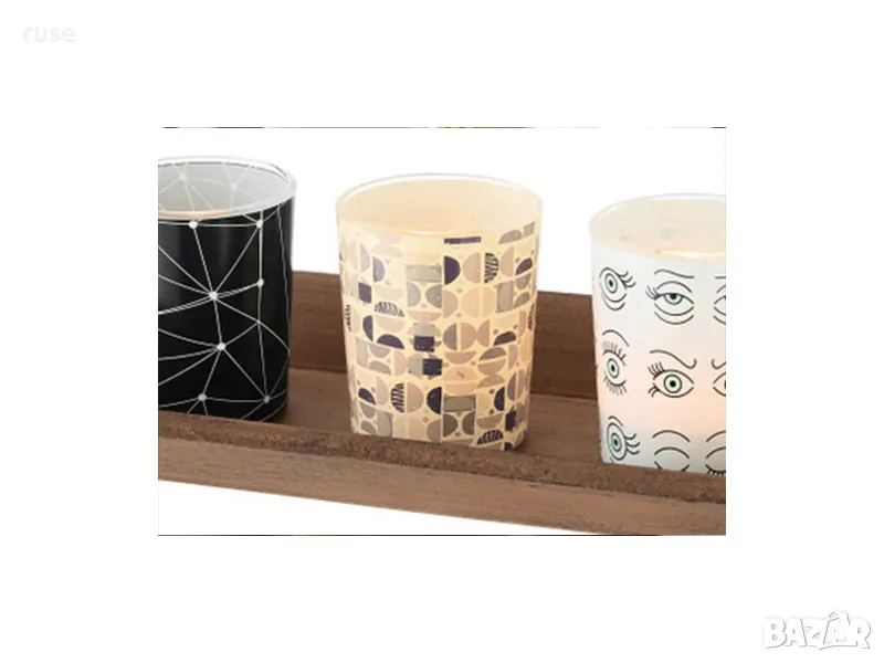 - 3 поставки за чаени свещи, изработени от стъкло, в 3 различни мотива, с диаметър около 5,5 см и височина около 6,5см