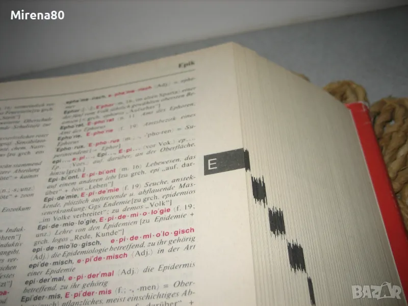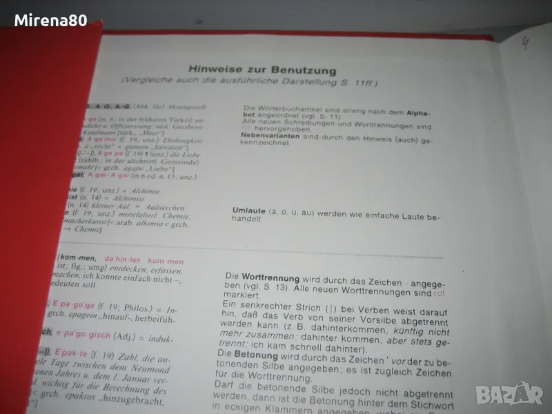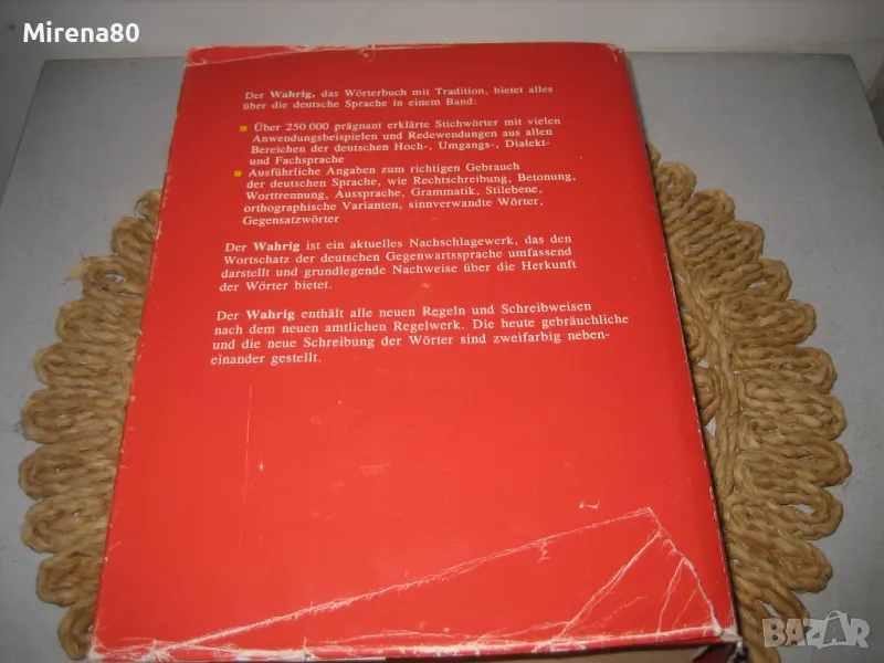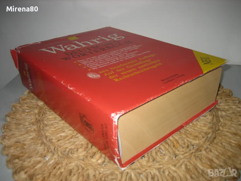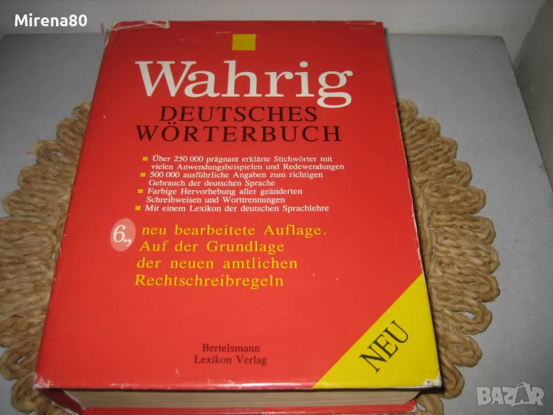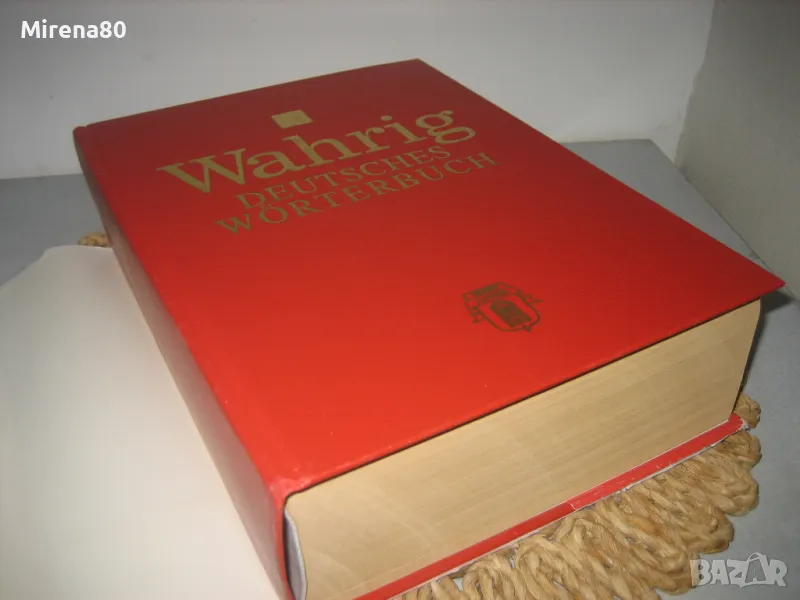 WAHRIG - немската Библия, която всеки немскоговорящ трябва да има ! Речникът е нов, огромен и тежи поне 4 кг. Съдържа над 250 000 думи и тяхното значение. Съвместно издание (немско издателство + Абагар Велико Търново) - 1999 г. Речникът е луксозен и много красив - твърди яркочервени кожени корици със златни букви, 1420 стр. Нов, неизползван !