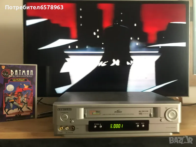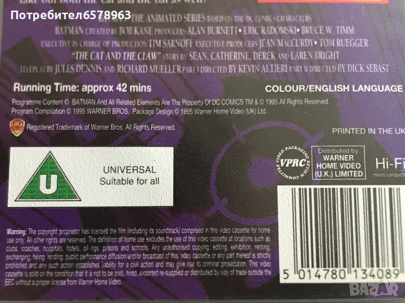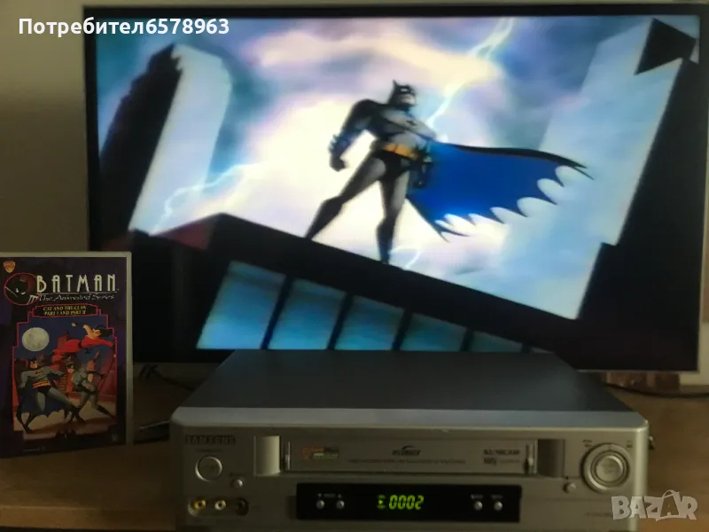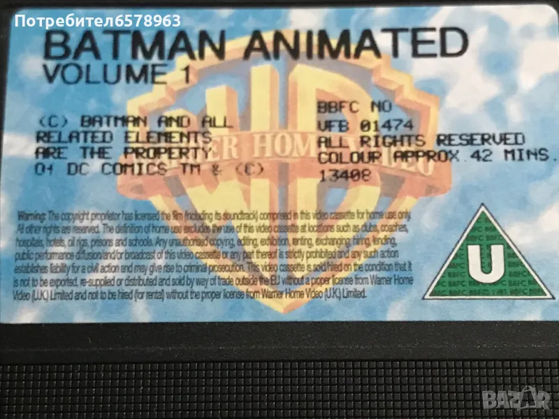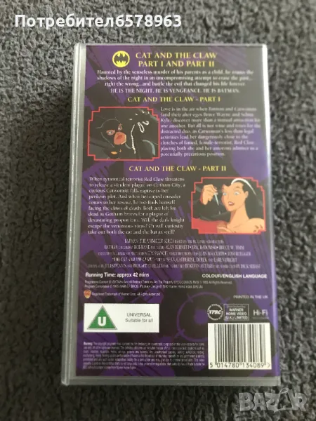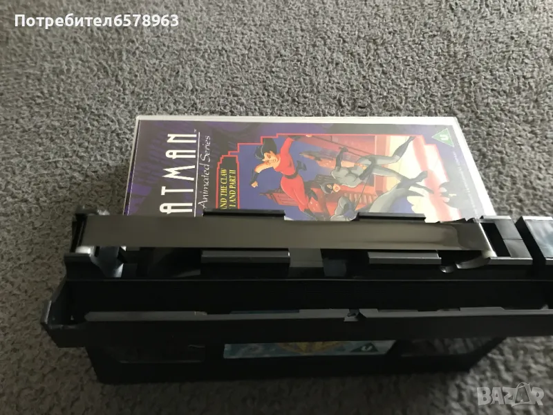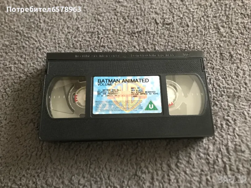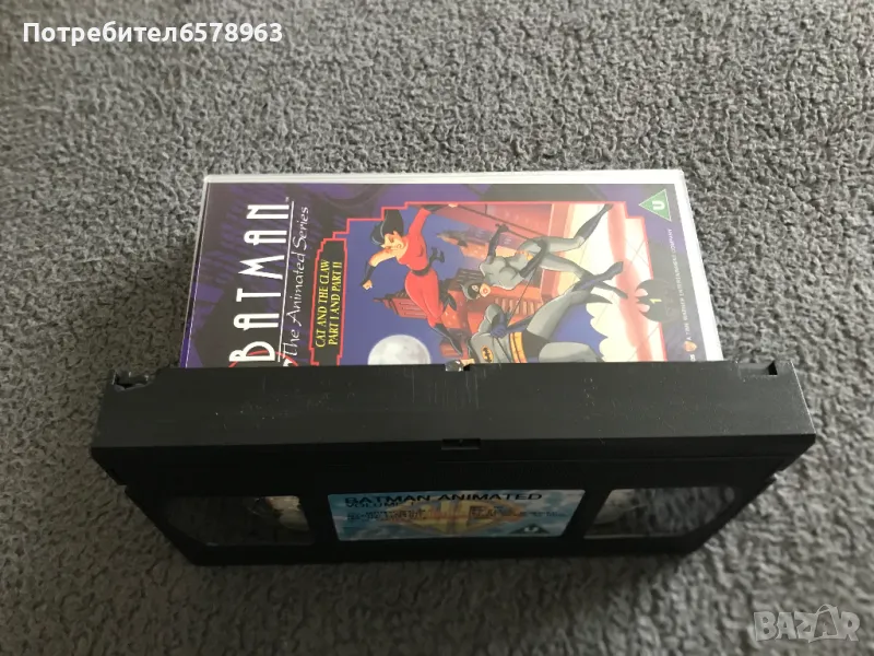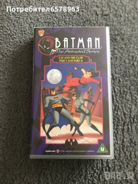 Продавам оригинална анимационна видеокасета '' BATMAN '' Видеокасетата е в прозрачна кутия с оригинален цветен стикер на самата касета . Отлично запазени , кутия , обложка , касета и лента . Общо състояние 10 / 10 . Касетата съм е гледал един единствен път и е буквално като чисто нова . Работи отлично от начало до край . Кристално качество на картината и звука . Касетата е много трудна за намиране от хитовата поредица на BATMAN . 1995 година , времетраене 42 минути . 18 снимки . От първа до седма снимка е снимана касетата в работещо състояние . Изпращам с Еконт или Спиди .