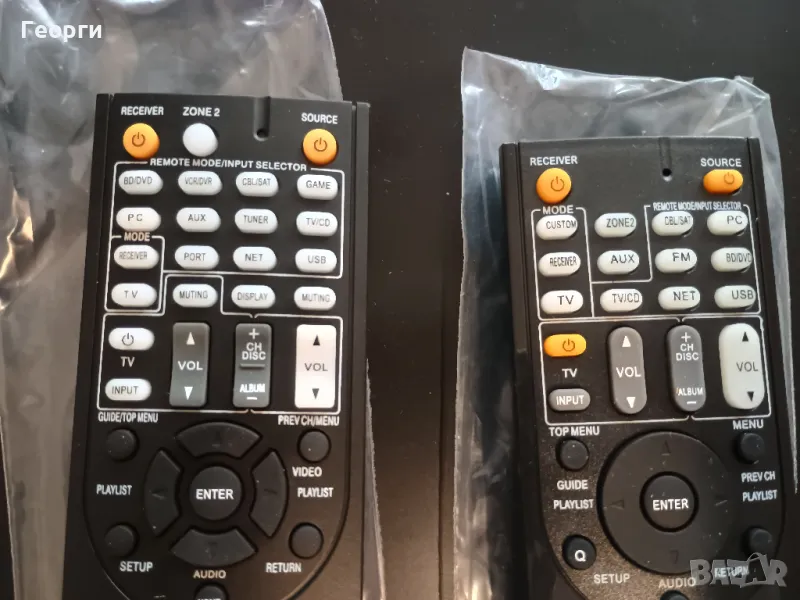 Дистанционните са комбинирани,.тоест управляват освен ресийвъри и други компоненти на тази марка. Има бутони за CD, декове, DVD, флашки и тн. Дистанционните са чисто нови, закупени от Амазон ДЕ, идват с чисто нови батерии всяко. Имам по 1 брой от всяко. Мога да направя още снимки.