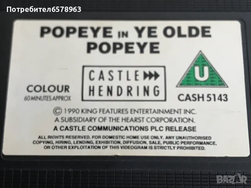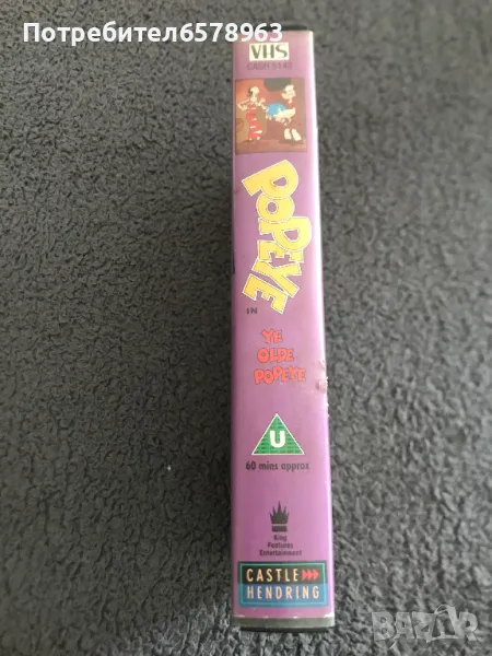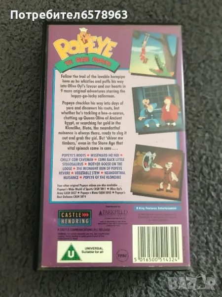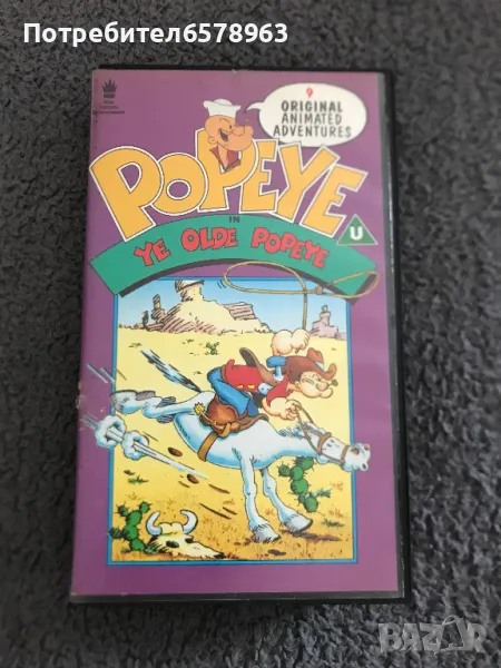 Продавам оригинална видеокасета '' Popeye '' Касетата е отлично запазена , работи перфектно отначало до край. Общо състояние 10/10. Времетраене 60 минути . 1990 година . 7 снимки . От 1-ва до 7-ма снимка е снимана касетата в работещо състояние . Цена 10 евро . Изпращам с Еконт или Спиди .