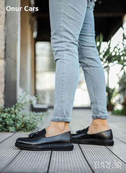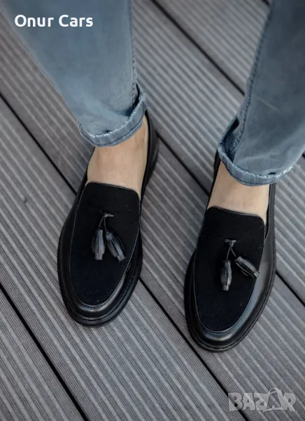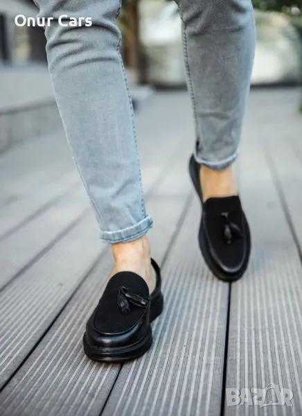 *Мъжки черни ежедневни обувки от еко кожа и велур без връзки с пискюли.*Моделът е спортно елегантен и може да се съчетава добре с разнообразие от дънки, спортни панталони, спортни ризи или тениски.*Удобен и изчистен модел.