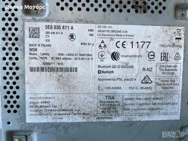 5E0035871A дисплей Монитор CD радио от Skoda Octavia 1.2 TSI, 110 ph, 6sp, engine CYVB, 2015g., 51 000 km, Шкода Октавия 1.2 ТСИ, 110 кс., 6 ск., код двигател CYVB, 2015 г., 51 000 км. в автоморга Delev Motors, между с. Каменар и с. Куманово гр. Варна.