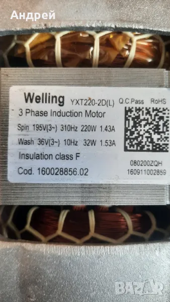 Продавам трифазен безчетков мотор от пералня Ariston.