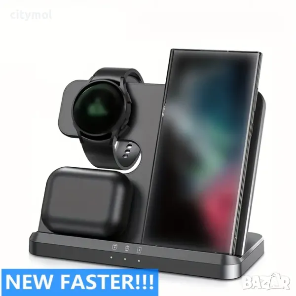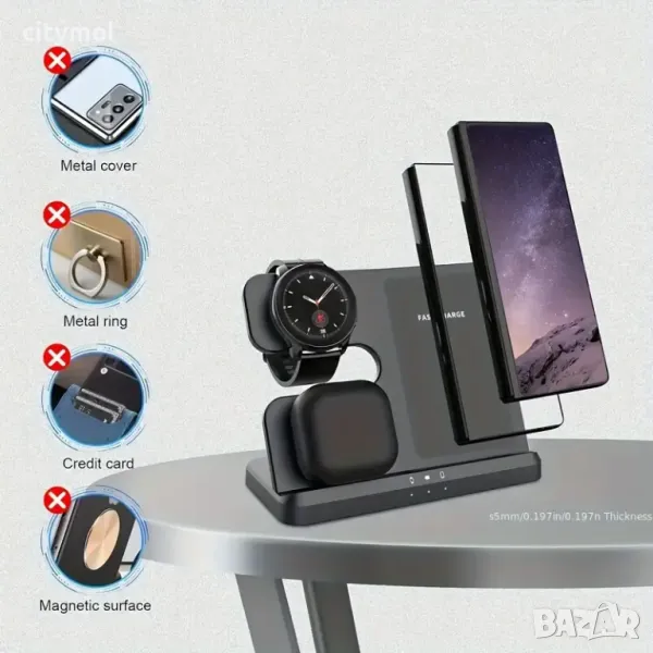 Мощност от 15 W, 10 W, 7,5 W за телефон, 5 W макс. за слушалки и 3 W макс. за часовник, тази станция за зареждане е съвместима с широка гама от устройства.