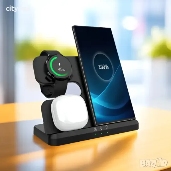 Безжичното зарядно устройство 3 в 1 може да зарежда едновременно мобилни телефони, смарт часовници и слушалки: Airpods/Galaxy Buds/ и др. слушалки с функция за безжично зареждане, което го прави идеален аксесоар за по-добро организиране на вашето офис/нощно пространство. Това безжично зарядно устройство може да се използва в офиса, за да поддържа телефона ви зареден през целия ден или у дома, с елегантен, нископрофилен силует и оптимизирана схема за зареждане на телефона ви възможно най-бързо.