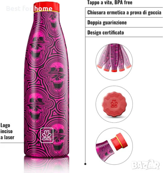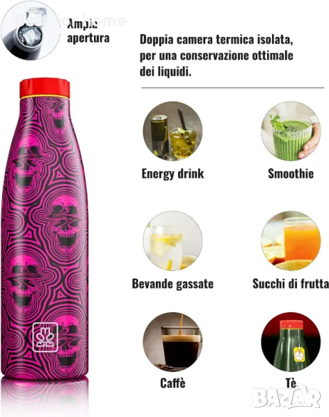 Италиански дизайн с грижовни, креативни и оригинални графики, вдъхновени от тенденции и авангарди. Специалната силиконова основа на бутилката е тиха и неплъзгаща се.