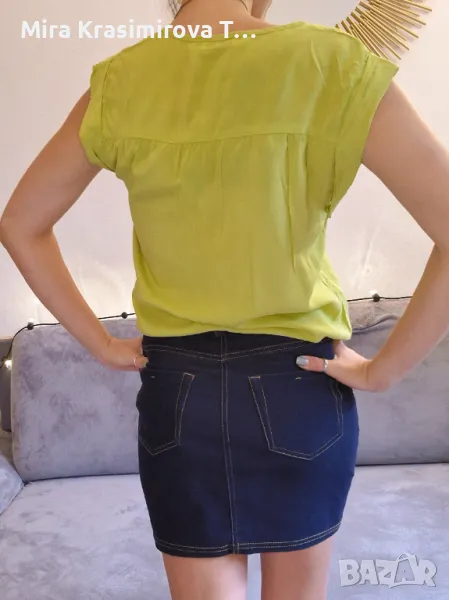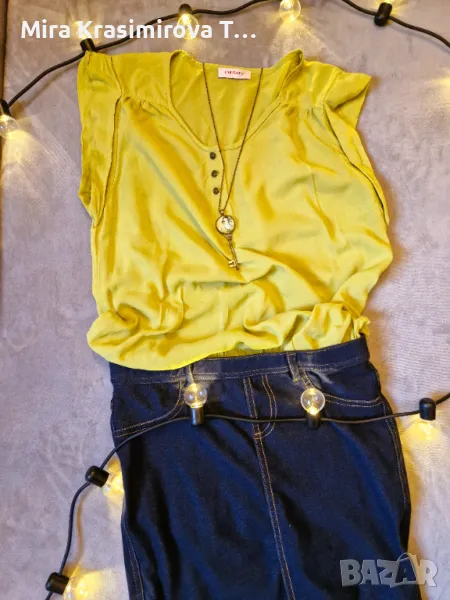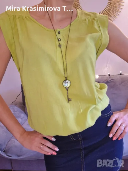 ✔ Горе – ефирна, свободно падаща част в лимонено-зелено с декоративни копчета