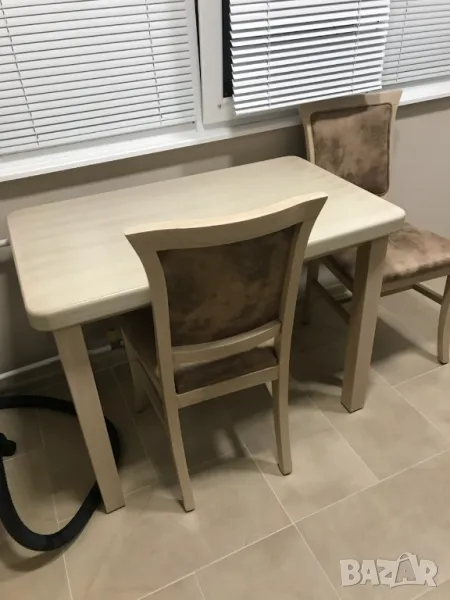 Комплекта е правен по поръчка, ползван е само няколко пъти! Има още два сгъваеми стола, от същата серия, които ги няма на снимките.Масата е с дебел плот и заоблени ръбове, с размери 100 / 60см., и не се разгъва...