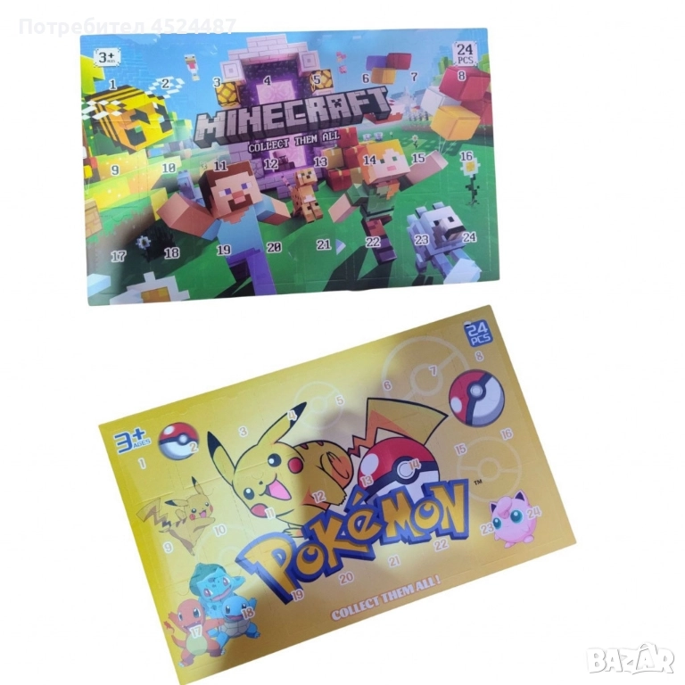 Тип продукт: Детски играчки;Тематични герои и дизайни – Minecraft, Pokémon, Stitch, Paw Patrol.;Забавен начин за отброяване на дните до празници;Ярки цветове и атрактивни илюстрации;Подходящи за деца над 3 години;Материал: Картон и пластмасови фигурки/аксесоари (вътрешно съдържание;Размери: Приблизително 35 х 25 см;Съдържание: 24 изненади във всеки календар (фигурки, мини играчки и др.)