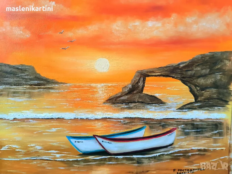 Морски залез,лодки и скали маслена картина → Обява 50233873