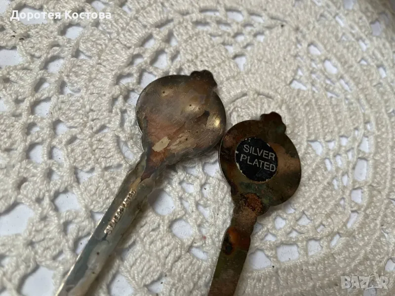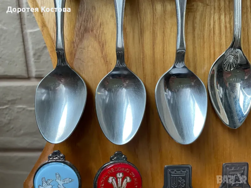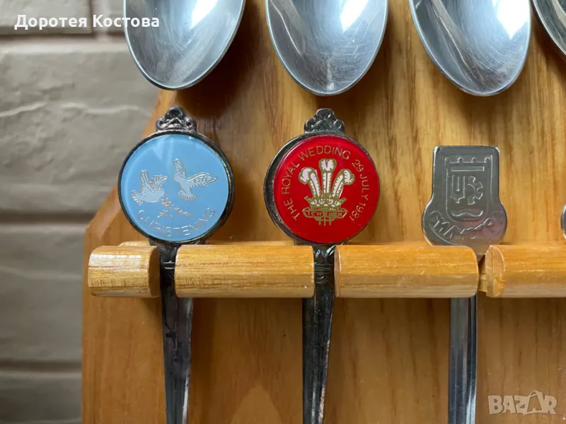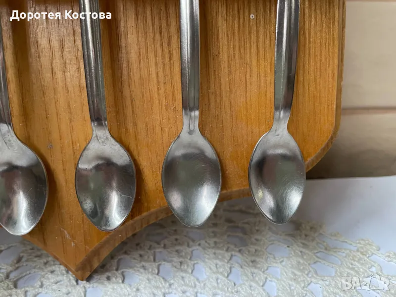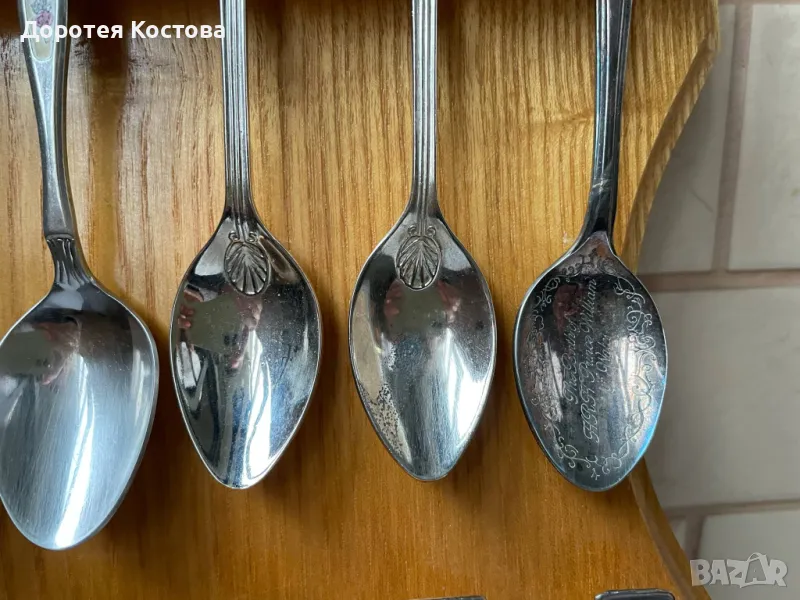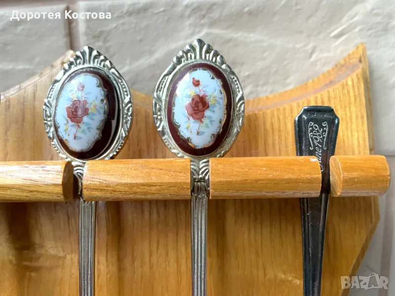 Красиви лъжички за чай/кафе с дървена стойка за стена, 8 бр са от Англия, 4 бр са стари български. Някои са посребрени, други са с порцеланов/керамичен елемент на дръжката / 5 броя на горния ред /. Лъжичките не са почистени, някои са с маркировки. Цена за всичко - 80 лв.